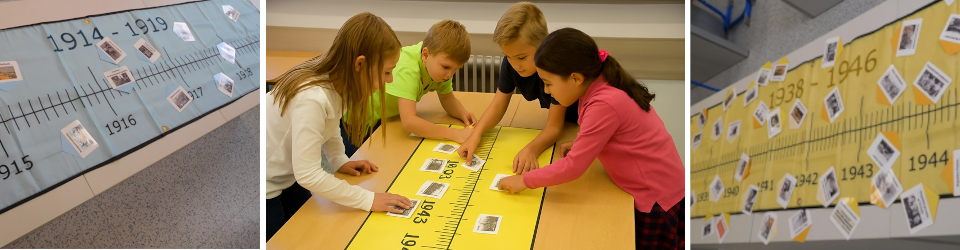 Sada obsahuje: Dvě časové osy – modrá se věnuje první světové a žlutá druhé světové válce; množství událostí, které žáci umísťují na číselné osy; řešení; černobílé osy k nakopírování.