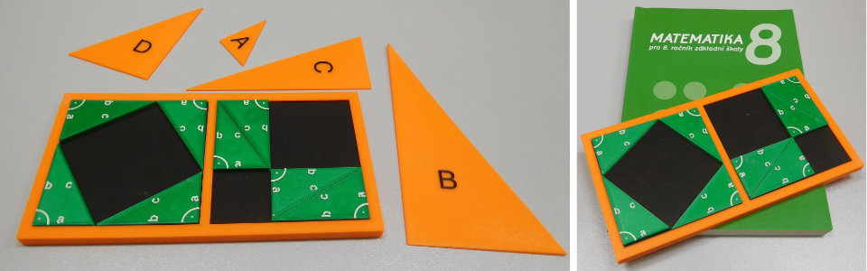 Sada obsahuje: Magnetickou tabulku rozdělenou na dvě čtvercové plochy, 8 ks magnetických pravoúhlých trojúhelníků, 4 ks pythagorejských trojúhelníků.